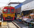 07h00: Salida hacia el mercado ferroviario de Maeklong. Este mercado recibe en tailandés el sobrenombre de Talat Rom Hup, que significa "mercado de paraguas desplegables". Es uno de los mercados frescos más grandes de Tailandia y está centrado en la vía del ferrocarril de Maeklong. Cada vez que se acerca un tren, los toldos y las fachadas de las tiendas se apartan de los raíles, para volver a colocarse una vez que el tren ha pasado.